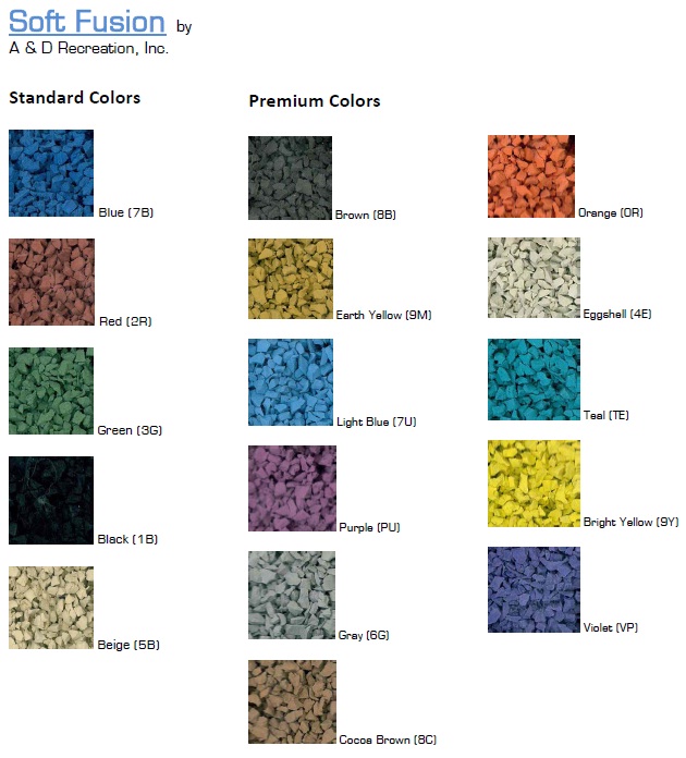 Pat Corsetti, Inc. now offers Soft Fusion Poured-In-Place Rubber Surfacing! Soft Fusion offers a seamless look while maintaining safety and handicapped accessibility. We offer this surfacing in a variety of different colors to meet all your needs. See the color chart below.